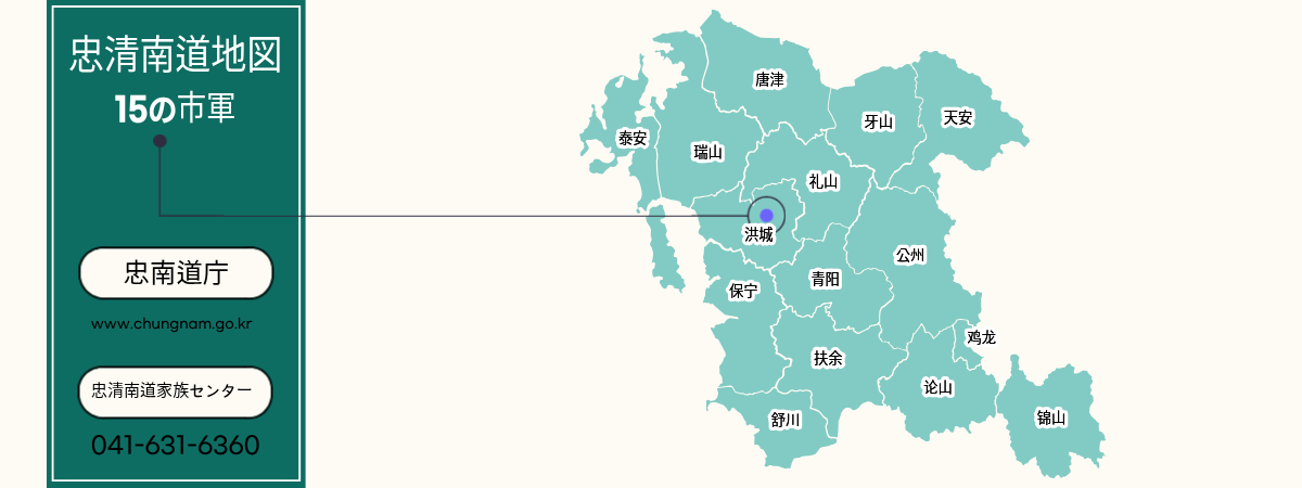 忠清南道は韓半島の中央部西側に位置する地域として北側には京畿道、東には忠清北道、南には全羅北道との境界を成しており、西側は西海と接する。また、大田広域市を囲んでいる。