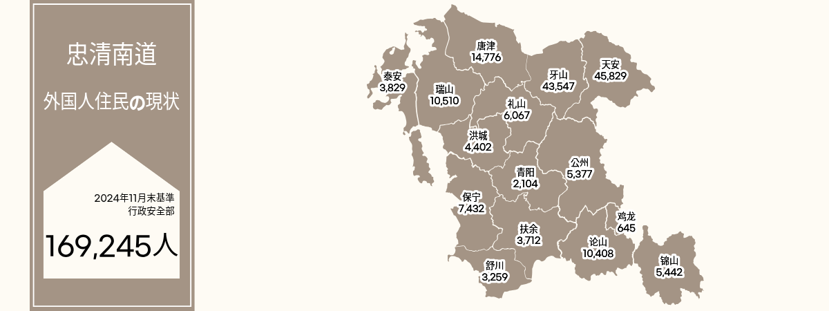 忠清南道外国人住民の現状:男性94,932人、女性74,313人、合計169,245人