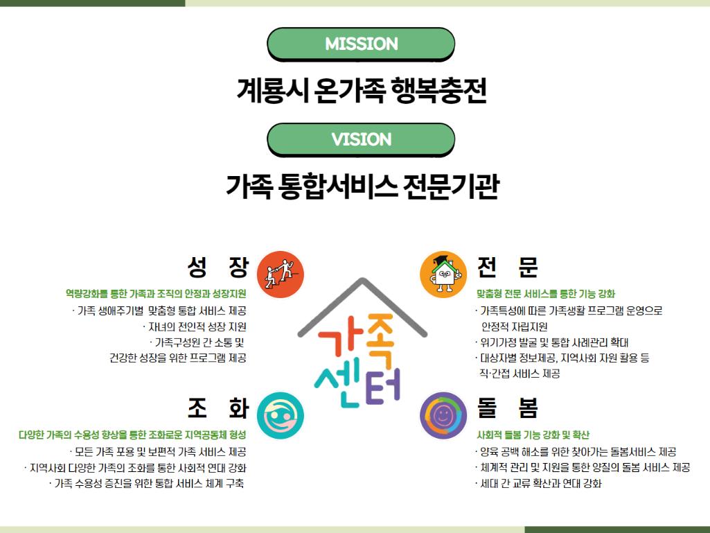 저희 센터는 가족통합서비스 전문기관으로서 계룡시 온가족 행복충전이라는 미션을 가지고